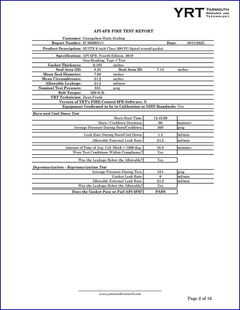 HUITE 6 inch Classis 300 FG Spiralis vulneris gasket, API 6FB experimentum ignis feliciter transivit, quod unicum experimentum gaskets ignis-tutum agnovit.